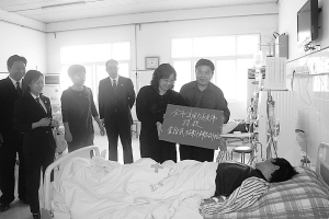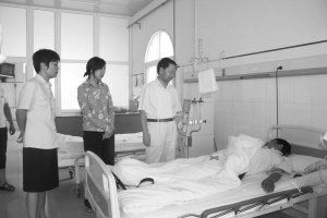 市委常委、政法委书记朱家臣在市中级人民法院院长张明山,市人大常委会法工委主任李廷文、西华县委常委、政法委书记周小燕的陪同下看望慰问赵克伟 (摄影 张永波)