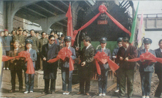 图为1987年3月28日,漯阜铁路周口段举行的通车剪彩仪式。中国科学院副院长于光远及省、地有关领导乘火车到周口段终点站沈丘站视察。