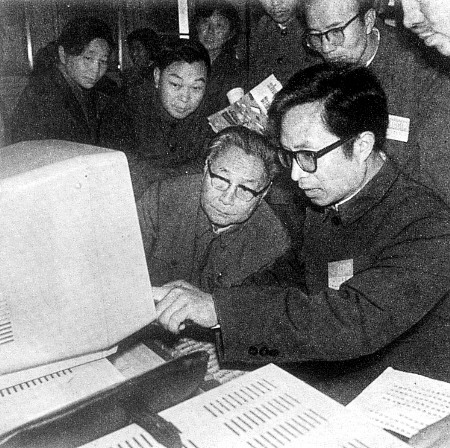 1983年,河南省取得重大科研成果,五笔字型汉字编码方案研究实验成功。图为国务院大规模集成电路和计算机领导小组办公室人员听取新方案创制人王永民的汇报。