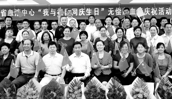 9月30日,10月1日出生的献血者在江西省血液中心合影。当日,来自江西各地的50多名10月1日出生的义务献血者,相聚在南昌江西省血液中心,为新中国也为自己庆祝生日。新华社发