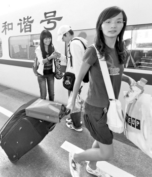温福铁路“动车游”成新热点 10月8日,一名游客乘“和谐号”高速列车抵达福州火车站。温福铁路的开通,改变了闽、浙、沪沿海游客的出游方式。10月1至8日,往返福州、温州、杭州和上海的各趟高速列车基本满员。据统计,国庆期间福州火车站共发送旅客7.2万人次,到站旅客5.2万人次,乘动车出游成为今年国庆长假的新热点。新华社记者 张国俊 摄