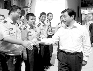 来到城郊派出所,杨廷俊查看了民警的到岗情况,并与民警亲切交谈。辖区内共有多少网上逃犯,打击“两抢一盗”都有哪些措施,案件结案率是多少?杨廷俊时不时地向警员提出问题。该所所长张锦民都一一作答,并向来慰问的领导作详细工作汇报,在29日晚,该所人员连夜布控,抓获了一名安徽非法上访逃犯。杨廷俊对该所民警的工作给予了肯定,并向他们提出要求,城郊派出所任务重大,是城区治安的重点区域,全所民警一定要下真功夫、真本事,确保取得实效,要在23个派出所中起到龙头作用。