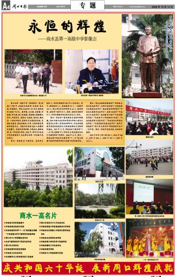 商水县第一高级中学(简称商水一高)创建于1952年,坐落在县城南部,东临周-驻公路,交通便利。学校占地面积130多亩,建筑面积60000平方米。教学楼、办公楼、实验楼、科技楼、学生楼、教工家属楼、高规格公寓楼鳞次栉比、井然有序。阅览室、电脑室、语音室、微机室、一体机印刷室、英语听力无线发射系统、多媒体电教室、高标准物理、化学、生物实验室等教学设备齐全,有能同时容纳4000人就餐的礼堂餐厅。校园内亭阁轩榭,小桥流水,绿树成荫,是一所花园式学校。2005年,晋升为河南省示范性普通高中,这是商水县第一所省级示范性高中。