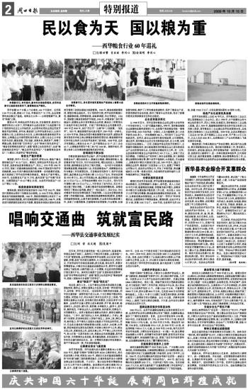 建国60年,特别是改革开放以来,在各级党委,政府的正确领导和关心支持下,西华粮食行业成功实现了由高度集中的计划经济向社会主义市场经济、从封闭半封闭状态到全面放开粮食市场的转变。多年来,粮食部门以科学发展为动力,以执行政策为己任,以服务社会为宗旨,以深化粮食流通体制改革为契机,以转换企业内部经营机制为重点,以建立社会主义市场经济为目标,解放思想,开拓创新,求真务实,真抓实干,取得了辉煌业绩,曾获市级“文明单位”、全市“招商引资先进单位”、“粮食目标管理先进单位”;省级“爱国卫生先进单位”;全省“粮食购销先进单位”、“粮企改革先进单位”、“仓储管理先进单位”、“小麦出口先进单位”等诸多荣誉。