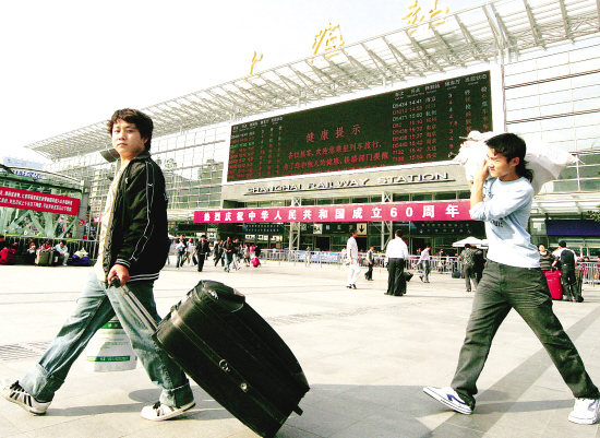 10月15日,来自河南的李宏海(左)和同伴走出上海火车站,希望在上海找到一份房屋装修的工作。据了解,2009年1月至9月上海市新增就业岗位52.9万个。