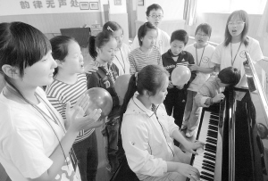 10月15日,盲人学生与大学生志愿者在一位盲人学生的钢琴伴奏下,一起合唱《隐形的翅膀》。当日是第26个国际盲人节,安徽大学春晖学社的10多名大学生志愿者来到合肥特殊教育中心,和这里的20多名盲人学生一起联欢、互动交流,让盲人学生度过了一个快乐的盲人节。新华社发
