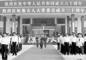 10月1日,伴随着雄壮的国歌,鲜艳的五星红旗迎风升起。当日8时,项城市委、市政府举行了隆重的升旗仪式,庆祝伟大祖国六十华诞。周口市委常委、项城市委书记王宇燕,项城市市长邹洪,项城市人大常委会主任孙玉祥等领导,与项城市委、市政府各部门主要负责人,市委办公室、市政府办公室全体人员参加了升旗仪式。记者 杨光林 摄
