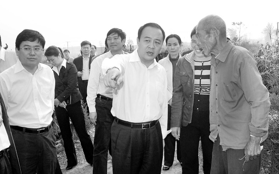 10月13日,市委书记毛超峰(中)在县长陈志伟(左一)的陪同下深入郸城县胡集乡郝寺行政村了解群众生产、生活情况。记者 王映 摄