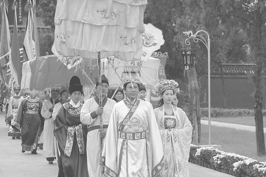 淮阳县太昊陵景区为丰富景区内容,再现传统祭祀文化,根据明代开国皇帝朱元璋祭拜太昊伏羲的史实,编排了祭祀乐舞。演员全部为景区工作人员,他们每天在景区内向游客演出。(陈卫东 摄)