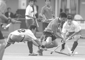 10月25日,内蒙古队两名球员围堵广东队球员(中)的进攻。当日,在山东济南进行的第十一届全运会男子曲棍球第5轮比赛中,内蒙古队以4比0战胜广东队。