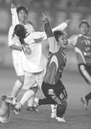 足球——女子成年组:辽宁队晋级决赛 10月25日,辽宁队球员庞丰月(前)在比赛中庆祝进球。当日,在青岛举行的第十一届全国运动会足球女子成年组半决赛中,辽宁队以2比1战胜山东队晋级决赛。