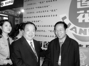 近日,国家工商行政管理总局局长周伯华在中西部博览会上亲切接见周口市工商局副局长刘铁士(右),并视察了我市莲花味精集团展厅,对近年来莲花企业的发展给予高度评价。(周工 摄)