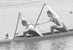 ▲皮划艇——杨文军/张志武获男子双人划艇1000米亚军 10月26日,奥运冠军、江西队选手杨文军(左)和搭档张志武在男子双人划艇1000米的比赛中。当日,在第十一届全运会男子双人划艇1000米决赛中,杨文军/张志武以3分42秒084的成绩获得亚军。