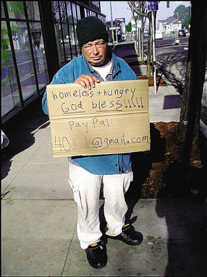 一位美国的乞丐深懂科技带来的便利及传播能力,拍了一张照片放到网络上,照片中的他,拿着纸牌说明自己无家可归并写上自己的E-mail,希望大家通过Paypal支付平台捐款给他。(小村)