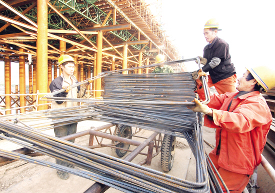 昨日清晨,大庆路桥施工现场一派繁忙景象。工人们正在忙碌地工作着,努力确保工程如期交付使用。 (记者 沈湛 摄)