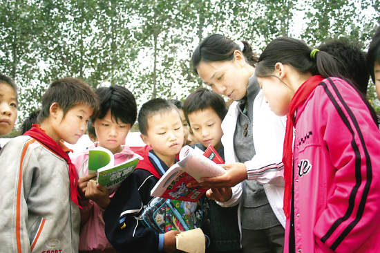 商水县法院驻张明乡工作队队员自筹资金5000余元,为所驻村庄的留守儿童和困难家庭学生购买学习用具和课外辅导书,得到了当地群众的一致称赞。图为驻村工作队员正在与孩子们一起阅读科普书。 (魏红 摄)