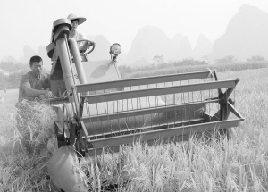 金秋十月,地处山间的广西融水苗族自治县大片晚稻成熟。金黄的稻穗、秀美的大山、劳作的农民构成一幅幅美丽的画卷。图为广西融水县小荣村村民驾着收割机在田间收割晚稻。 新华社发