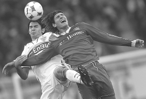 10月31日,拜仁队球员戈麦斯(右)与斯图加特队球员塔什彻争顶。当日,在德国足球甲级联赛第11轮比赛中,拜仁慕尼黑队客场以0比0战平斯图加特队。