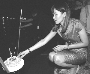 10月31日,在泰国首都曼谷湄南河边,一名妇女在放流水灯。当天,一年一度的泰国水灯节在曼谷开幕。人们来到河流湖泊岸边放流水灯,祈求吉祥平安。 新华社记者 史先振 摄