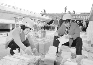 在我市重点工程建设现场到处都可以看到“半边天”的身影,她们身着工作服精神抖擞,干起工作来干净利索,大有巾帼不让须眉之势,来自市郊的几位女工告诉记者:“男人们外出打工挣钱,我们不出家门也能挣钱!” (记者 沈湛 摄)