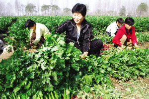 近年来,淮阳县委、县政府坚持围绕“农”字做文章,大力发展无公害、绿色蔬菜规模化种植,既增加了菜农收入,也解决了一批剩余劳动力。图为菜农正在收获西芹。(李霞 摄)