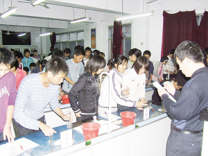 为落实上级中小学办学行为规范,减轻学生负担,推进素质教育,近日,郸城一高举办了物理、化学、生物实验技能竞赛,提高了学生的动手能力和独立解决问题能力,受到学生的欢迎。图为物理实验技能竞赛时的情景。(王雪涛 摄)