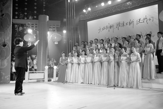 为庆祝第十个记者节,周口电视台于11月8日晚举办了“心相通 情相融”联欢晚会。图为电视台合唱团在演唱晚会主题曲。 (冯卫光 摄)