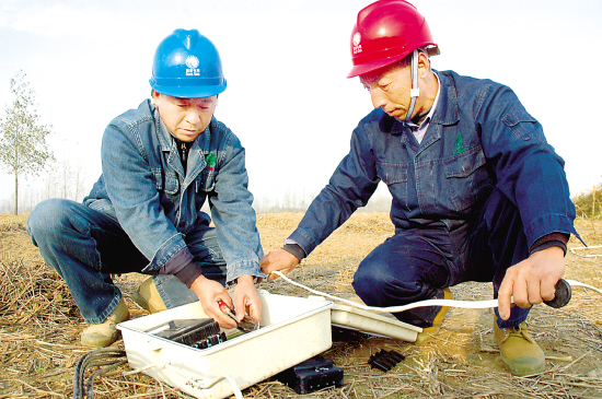 为确保扶沟县工业园区项目用电需求,扶沟供电公司积极落实园区供电线路勘测设计,开辟用电绿色服务通道,为工业项目落户园区作出了重要贡献。图为该公司工作人员在工业园区内检查漏电保护器。(记者 李寒 摄)