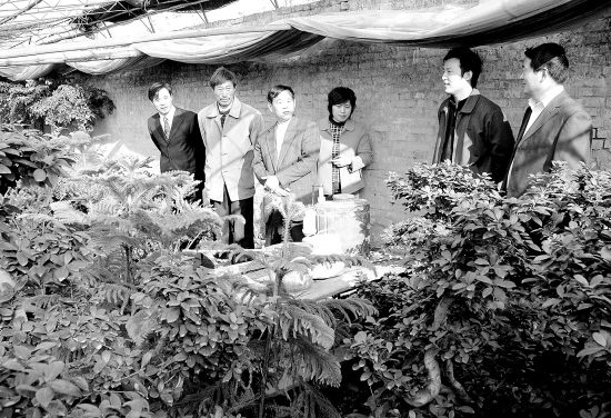 商水县城关乡农民结合市场和地域优势,发展草木花卉种植业,现已发展成拥有30多个系列品种、100多种花卉的花木生产基地,在豫东、豫南、皖西享有盛名。图为到该乡大井行政村花卉基地参观的客商。 (记者 沈湛 摄)