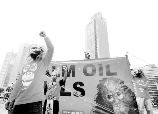 呼吁拯救印尼猩猩 11月12日,在印度尼西亚首都雅加达,来自印尼加里曼丹岛的一个猩猩保护中心成员头戴猩猩面具参加抗议活动。据该猩猩保护中心称,当地对森林的过度砍伐严重破坏猩猩的生存环境。如果不采取有效措施,20年后野生红毛猩猩将会在加里曼丹岛消失。新华社记者 岳月伟 摄
