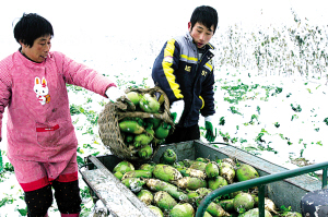 11月15日,川汇区城北办事处彭埠口村的菜农在被冰雪覆盖的菜地里抢收蔬菜。11日以来的风雪冻雨给我市农村蔬菜生产和采摘、运输都造成了很大困难,蔬菜生产受灾严重。广大农民积极开展生产自救,抢收蔬菜,争取把雪灾造成的损失降到最低。