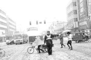 11月12日,一名交警正在沈丘县城区长安路与颍河大道交叉路口指挥交通。沈丘迎来入冬后第一场雪后,县交警大队及时启动雨雪恶劣天气应急预案,出动警力128人,警车12辆,对辖区内主要交通道路实施协调管理与勤务保障工作,保证了道路畅通。(张煜贞 摄)