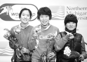 11月14日,中国选手周洋(中)和刘秋宏(左)在颁奖仪式上。当日,在美国马凯特举行的短道速滑世界杯系列赛暨温哥华冬奥会资格赛最后一站比赛中,周洋以2分22秒700夺得女子1500米冠军,刘秋宏以0.170秒之差获得银牌。 新华社/法新