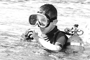 | 6岁的黎巴嫩男孩阿里·尤尼斯在地中海沿岸的苏尔进行训练。他正在挑战吉尼斯世界纪录,期望成为最年轻的使用自携式水下呼吸器的潜水员。
