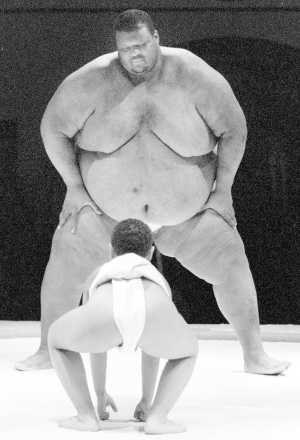 | 2002年4月6日,一名7岁儿童在布拉格向世界上最重的相扑选手、体重350公斤的美国选手亚伯勒发起挑战。