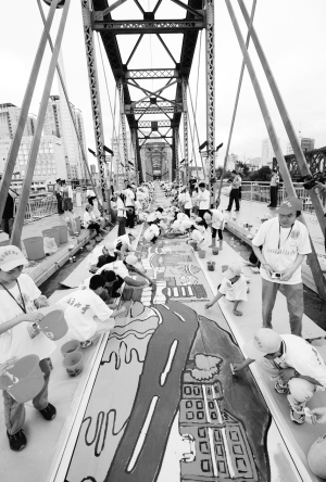| 2008年6月18日,中国辽宁丹东的400多位小“画家”在鸭绿江断桥上作画。他们绘制的总长度202.06米的巨幅儿童填色画打破了161.73米的世界纪录。