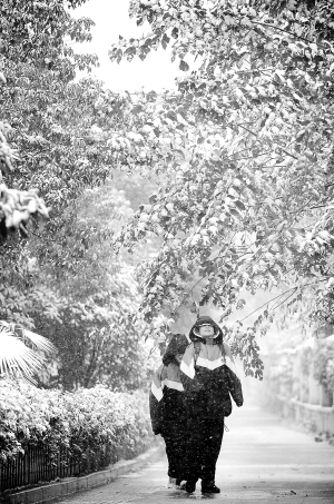 武汉迎来20年来最早初雪 11月16日,两名学生在武汉积雪的人行道上行走。 从11月15日晚开始,武汉出现20年来最早初雪,16日白天降雪量逐渐增大,当地的最高气温从11摄氏度陡降至3摄氏度。