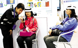 低成本健康体检设备亮相高交会 市民在展馆里体验中医经络按摩仪。该仪器采用次声波信号对人体进行按摩。在11月16日开幕的第十一届中国国际高新技术成果交易会上,由中科院深圳先进技术研究院开发的面对普通老百姓的低成本高技术家庭健康产品吸引了众多参观者。