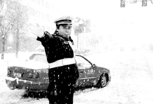走到人民商场,看到三位交警在执勤。两位年轻交警在忙着指挥车辆通行,年纪大一些的在推一辆车轮打滑的车,厚厚的雪花遮住了他们的警服,在白雪的衬托下,警服的深蓝色格外美丽。抬头一看,红绿灯在这样的天气里也耍起脾气罢工了,可是交通秩序依然良好,行人们都很遵守交通规则,好像红绿灯依然在工作。车辆也是按照交警的手势行驶,一切都是这么井然有序,虽然大雪还在肆虐,虽然红绿灯依然没有指示,但这一刻,似乎每个人心中都有一盏红绿灯。