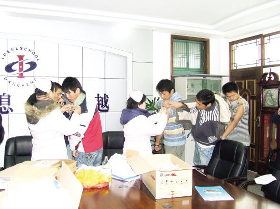 11月16日,为应对甲型H1N1流感多发期,保证师生身体健康,郸城一高积极协调郸城县卫生局、郸城县疾控中心为师生注射甲型H1N1流感疫苗。图为该县疾控中心医务人员为郸城一高师生接种甲型H1N1流感疫苗的情景。(王雪涛 摄)