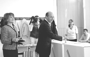11月22日,罗马尼亚现任总统伯塞斯库与夫人在布加勒斯特市中心一个投票站投票。罗马尼亚总统选举于当地时间22日清晨拉开帷幕,全国超过1835万名选民投票选举未来5年的国家最高领导人。共有12名候选人参与角逐,其中呼声最高的是获得执政的民主自由党支持的现任总统伯塞斯库、议会最大反对党社会民主党主席杰瓦讷和国家自由党主席安东内斯库。新华社发