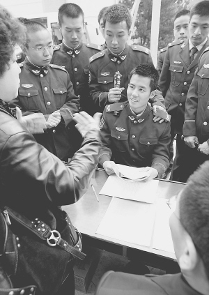 11月22日,一些即将退伍的老兵正在与地方用人单位洽谈招聘意向。当日,武警上海总队三支队党委举办“优秀退伍战士人才招聘会”,闻讯赶来的12家地方用人单位来部队争抢退伍兵,共有近45%的优秀退伍老兵与招聘单位当场达成用工意向。几年军旅生活的锤炼,退伍战士以过硬的军事素质、严明的组织纪律和甘于奉献的吃苦精神受到招聘单位的青睐。