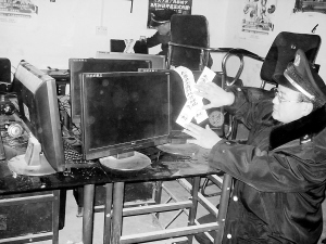 目前,一些黑网吧随着工商部门打击力度的加大,开始向“家庭式”经营转变,电脑多的六七台,少的二三台。针对这种情况,自10月中旬起,太康县工商局联合该县文化、公安等部门对全县“家庭式”黑网吧进行了集中整治。截至目前,该县工商局已查处取缔“家庭式”黑网吧55家,共扣押电脑120台。图为执法人员正在张集镇张庄村查封“家庭式”黑网吧的电脑。(王慧星 张学广 摄)
