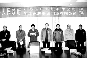 本报讯 (记者 刘俊涛)11月20日上午,江苏佳庆纺织有限公司、浙江永康来客门业有限公司在太康县委综合楼会议室举行了简单而隆重的签约仪式。县委副书记任英,县委常委、常务副县长许国民,县委常委、副县长宋志军及江苏佳庆纺织有限公司董事长胡平、浙江永康来客门业有限公司董事长李冰出席签约仪式。县发改委、县工业局、县招商办等10多家单位负责同志参加签约仪式。签约仪式由县委常委、常务副县长许国民主持。