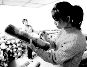 广西柳城县农民利用冬闲时节积极发展食用菌生产。目前,柳城县250万平方米食用菌的生产计划已得到落实,预计到年关便可收获。图为柳城县冲脉镇米村梦桥屯村民兰桂珍正在培育香菇菌棒。新华社记者 张爱林 摄