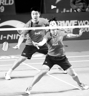 11月22日,中国选手郑波/马晋(前)在比赛中回球。当日,在2009中国羽毛球公开赛混双决赛中,郑波/马晋以1比2负于韩国选手李孝贞/李龙大,获得亚军。