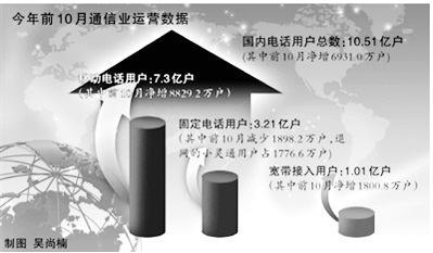 记者前日从工业和信息化部了解到,截至10月底,我国的电话用户总数已达到10.51亿户。同时,今年累计新增互联网宽带用户1800.8万户,宽带用户总数突破亿户大关。 新华社发