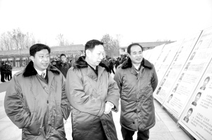 近日,中央综治委考核检查组组长、 教育部思政司副司长迟刚毅(右一),省委政法委副书记、省综治办主任王建西(中)在鹿邑县委书记杨廷俊陪同下在老子文化广场观看该县“秋季严打风暴”成果展。日前, 中央综治委考核检查组和省综治办领导莅临鹿邑检查督导社会治安综合治理和平安建设工作。(闫子健 摄)