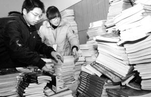 11月26日,安徽大学两名学生在勤工俭学中心整理回收到的旧教材。安徽大学勤工俭学中心从2005年起,收购学生的废旧教材,再以低价卖给需要的学生,实现了旧教材的循环利用。目前,该中心每年收购废旧书60吨左右,其中约25吨可循环利用。每年还举行旧书捐赠等公益活动,受到了学生的欢迎,产生良好的社会效应。 新华社记者 李健 摄