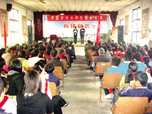 近日,商水县平店乡中心校和计生协、妇联会组织广大留守儿童深入开展爱国守法思想教育活动,并举办了一场“遵纪守法、珍惜自我”为主题的歌咏比赛,来自全乡中小学的28个代表队参加了比赛。图为比赛现场。